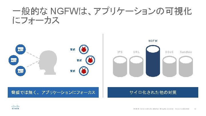 一般的な NGFWは、攻撃前の保護を行い、 攻撃中や攻撃後への効果が小さい 連続的な攻撃 BEFORE 攻撃前 DURING 攻撃中 AFTER 攻撃後 Silos Typical NGFW アプリケーション制御 IPS URL GAP DDo. S Sandbox Incident Response © 2016 Cisco and/or its affiliates. All rights reserved. Cisco Confidential 5