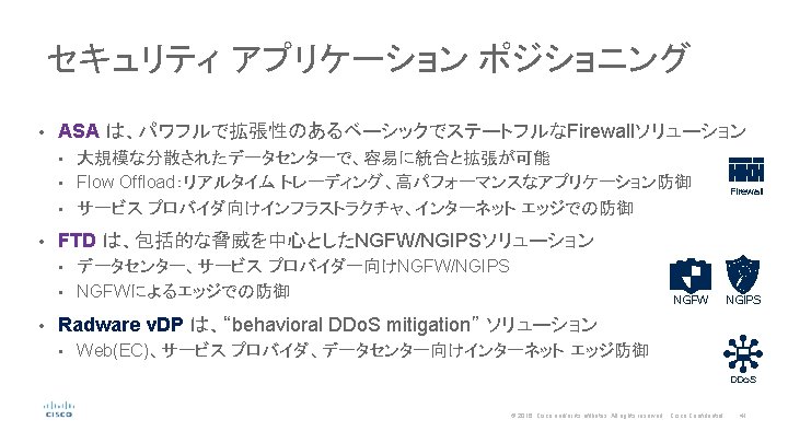 ASA in サービス プロバイダ Hosted Services Evolved Packet Core MME S-GW PCRF HSS S 2 S VPNでの mobile backhaul コネクション 防御 GTP/Diameter インスペクシ ョン、アドバンスド フィル タリングポリシーでの、 roaming agreements, billing systems 防御 P-GW モバイル クライアント向 け、ステートフルな Internet edge 防御 と CGNAT Roaming Partner MME ホスティング(Iaa. S)サービス向 け、マルチ コンテキストによる ステートフルな Internet edge 防御 外部SP向けのステートフルな 境界の防御 Internet S-GW PCRF External Service Provider © 2016 Cisco and/or its affiliates. All rights reserved. Cisco Confidential 43