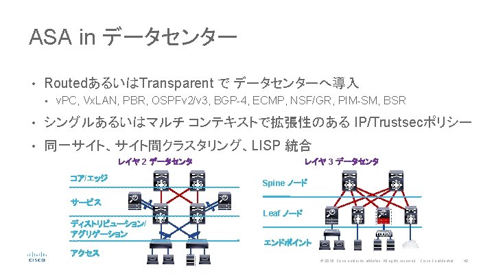 ASA スケーラブル VPN ターミネーション • スタンドアロンあるいはフェイル オーバー構成で拡張性のあるS 2 S/RA VPN • ダイナミック Crypto mapとOSPF/BGPで、リバース ルート インジェクション (RRI) RAVPN with ASA Load-Balancing RRI S 2 S VPN with Nexus ITD Chassis 2 Chassis 1 RRI RRI Mas ter. 10 . 20 203. 0. 113. 0/24 . 30 . 10 . 20 . 30 198. 51. 100. 0/24 . 10 . 30 . 20 10. 1. 1. 0/24 203. 0. 113. 0/24 10. 1. 1. 85 . 40 . 50 . 60 Intelligent Traffic Director VIP. 1 10. 1. 1. 100 172. 16. 171. 0/24 192. 168. 1. 0/24 © 2016 Cisco and/or its affiliates. All rights reserved. Cisco Confidential 44