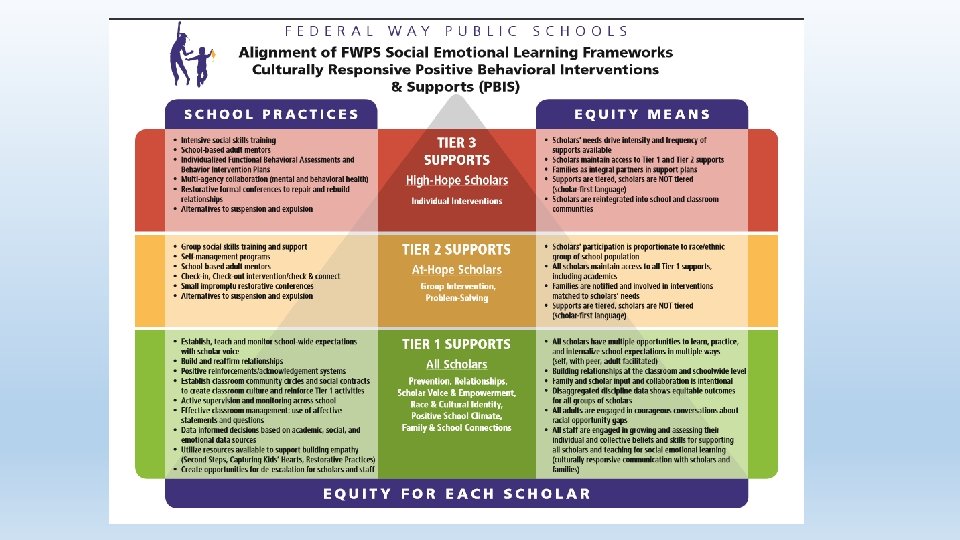 FWPS Strategic Plan: PBIS… üIs a signature strategy within Goal 2 The Whole Child üConnects to: üPillar 2 Safe Climate & Strong Relationships with Families & Community üPillar 4 Data-Informed Continuous Improvement üCan have positive impact on measures of progress: • %of scholars who feel their school is safe and welcoming as measured by a perception survey • % of scholars participating in at least 95% of classroom instructional time • Increased attendance • Decreased discipline incidents