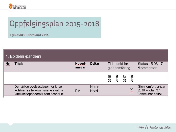 Oppfølgingsplan 2015 -2018 Strategiske valg – prioriterte oppfølgingsområder de neste 4 år 1. 2. 3. 4. 5. Epidemi /pandemi Svikt i kritisk infrastruktur (strøm, ekom og transport) Akutt forurensning i sjø Alvorlig voldshendelse i utdanningsinstitusjon Atomhendelser Andre oppfølgingsområder som er prioritert: 6. 7. Klimatilpasning og forebygging av naturskader Oppfølging av kommunal beredskapsplikt