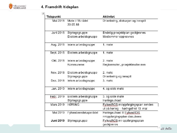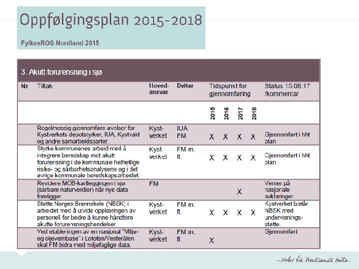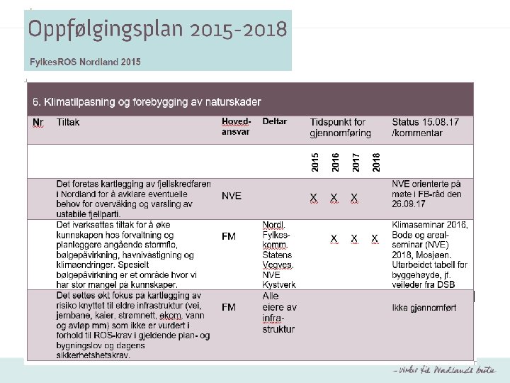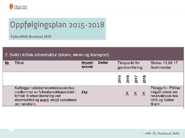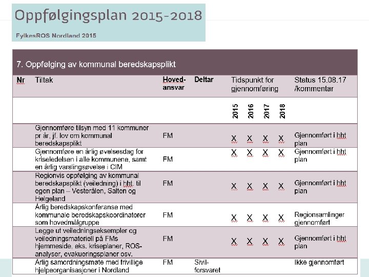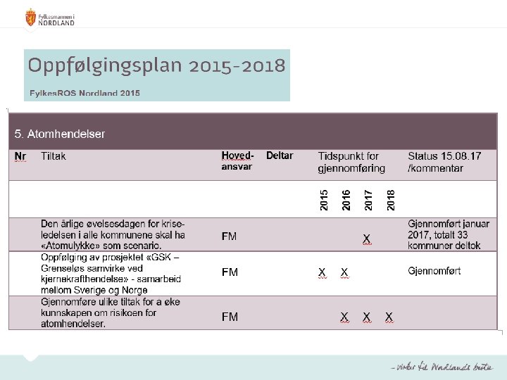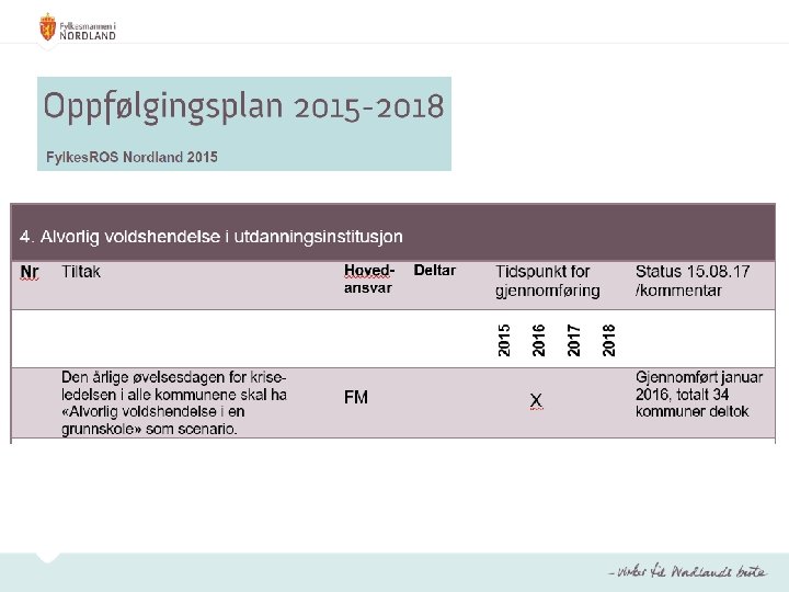 Oppfølgingsplan • Inneholder tiltak som FM har et hovedansvar for å initiere og gjennomføre, jf. FMs samordnings- og pådriverrolle • Inneholder tiltak som andre regionale aktører har et hovedansvar for når dette er ønskelig (samarbeidstiltak) • Skal årlig oppdateres og forelegges fylkesberedskapsrådet