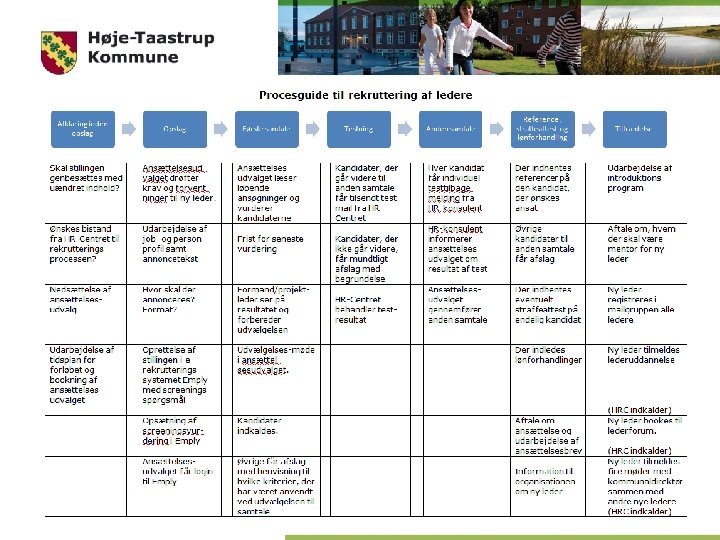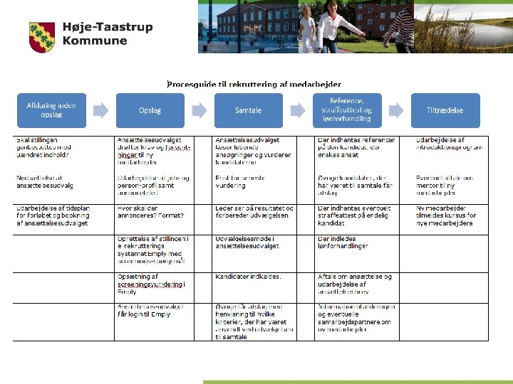 Typisk indhold i job- og personprofil 1. Informationer om den institution/afdeling, der søger: – – Organisatorisk placering Opgaver Antal medarbejdere Generelt om kommunen og politikker 2. Informationer om stillingsindholdet – Beskrivelse af den ledige stilling 3. Opgaverne i jobbet – Hvad forventes den nye leder/medarbejder at skulle beskæftige sig med på kort og langt sigt? 4. Krav til kandidaterne – – 5. 6. 7. 8. Faglige kompetencer og erfaring Personlige kompetencer og adfærd Yderligere ønsker (men ikke krav) Informationer om tidsplanen for processen Informationer om ansættelsesudvalgets sammensætning Hvem man kontakte, hvis man ønsker yderligere oplysninger