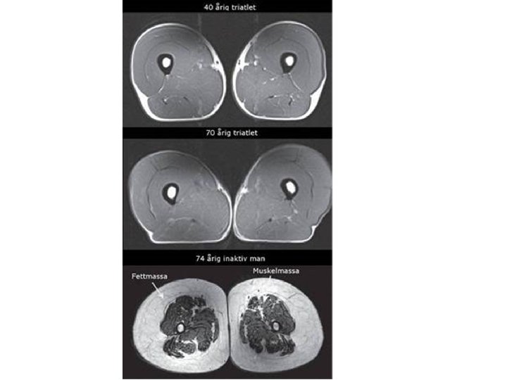 Sarkopeni • 1 % av din muskelmassa förvinner per år > 40 års ålder • > 70 års ålder snabbare sarkopeni • Främst de snabba muskelfibrerna som förtvinar först