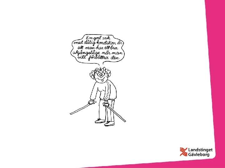 Att tänka på vid fysisk aktivitet • Börja försiktigt, öka i små steg! • Aktiviteten ska ge energi - inte ta energi! • Aktiviteten ska ej vara smärtsam eller leda till mer smärta än vanlig träningsvärk i tränad muskulatur ett dygn efteråt • OBS! bland är det svårt att träna ex. efter svår operation, intensiv kemoterapi/strålbehandling, uttalade biverkningar –Tänk då att lite är bättre än inget • Osäker? Ta hjälp av fysioterapeut/sjukgymnast