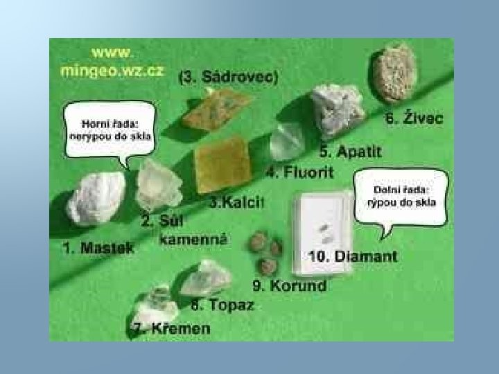 Zdroje: http: //www. infoescola. com/wp-content/uploads/2010/05/platina. jpg http: //www. styblovky. estranky. cz/fotoalbum/gelove-nehty/pruhledne-tipyslida. html http: //bydleni. dama. cz/clanek. php? id=11213 http: //www. buylodestones. com/ http: //web. natur. cuni. cz/ugmnz/mineral/vlastnosti. html http: //ekolist. cz/fotobanka/displayimage. php? album=63&pos=2 http: //www. prvky. com/zemska-kura. html Černík, V. , Martinec, Z. , Vítek, J. Přírodopis 4 mineralogie a geologie se základy ekologie: pro žáky základní školy a nižší ročníky víceletých gymnázií. 1. vyd. Praha SPN 1998, 87 s. ISBN 80 -7235 -044 -7