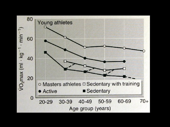 Aerobní kapacita – VO 2 max - aerobní kapacita klesá s věkem jako následek zejména poklesu TFmax, ale i úbytku svalové tkáně, zhoršení schopnosti distribuce krve z orgánů do pracujících svalů a schopnosti svalů využít O 2 - velikost je možné i ve starším věku zvýšit vytrvalostním tréninkem, trénink však nezastaví dlouhodobý postupný pokles