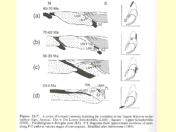 2) Relaxace tepelného porušení směrem ke stálému stavu (steady state) • po skončení tektonického procesu 3) Změna hloubky horniny v důsledku zdvihu a eroze nebo tektonického ztenčování • ztluštělá kůra je isostaticky nestabilní (není v isostatické rovnováze) • zdvih a eroze (pohoří geomorf. nestabilní) eroze denudace/odstranění nadložních hornin exhumace hornin Model ET 84 – eroze 0. 29 mm/rok • tektonické ztenčování – svrchní kůra – gravitační skluzy či poklesy (low-angle) střední a spodní kůra – duktilní střižná deformace. Model ET 86 – tektonické ztenčování 1 mm/rok • změna mocnosti kůry – hornina se „vrací“ od relaxované geotermy ke stálé - snížení tlaku a pohyb horniny blíže k povrchu - chladnutí