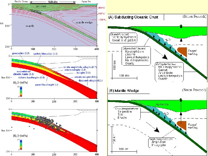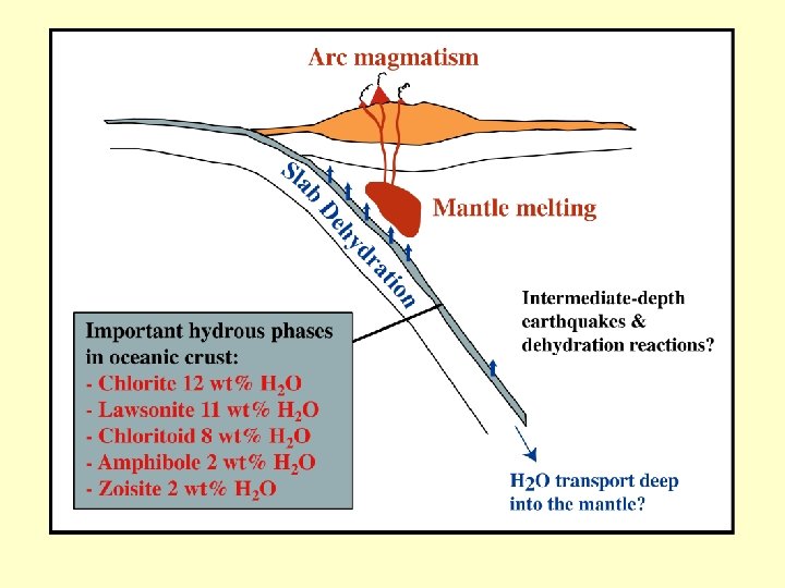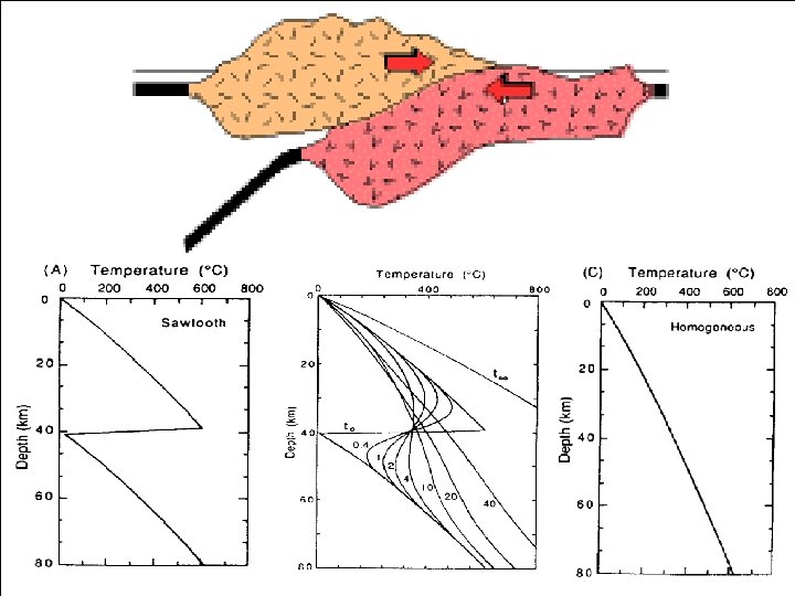 • 1) Porušení tepelné a geologické struktury kůry • (a) Subdukce studené oceánské desky pod oc/kont stlačené geotermy • (b) Ztluštění kůry (kontinentální) – násuny homogenní ztluštění kůry • (c) Ztenčení kůry - extenzí (intrakontinentální rifting), gravitační skluz příkrovů • (d) Vrásnění • (e) Intruze magmatu