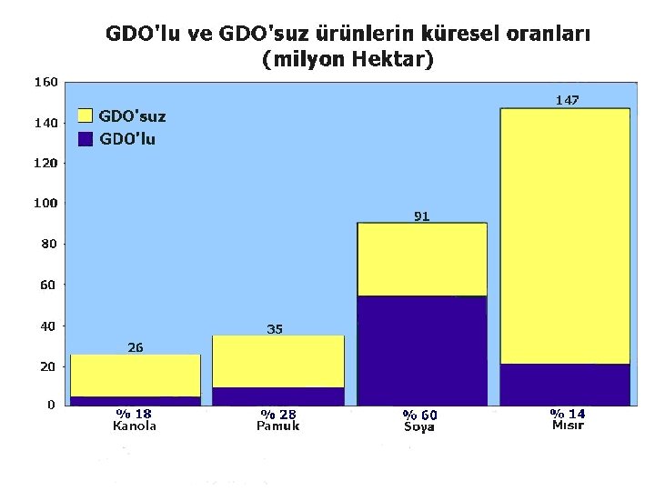 Alınabilecek Önlemler • GDO’lu tohumların kontrolsüz alanlarda ekimine izin verilmemeli, • Gümrüklerde, iç piyasada etkin bir denetim sistemi kurulmalı, • Türkiye’de GDO’lu ürünler konusunda kendi araştırmalarını yapmalı, teknolojisini kendi üretmeli, • Tarımda, girdiden çıktıya, tüm alanlarda bağımlılık zincirini kıran, kendi potansiyelini kullanan bir politika izlenmelidir.