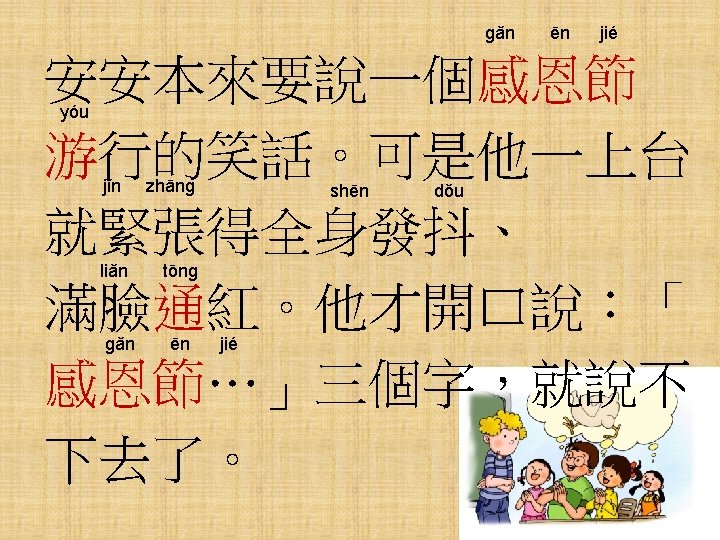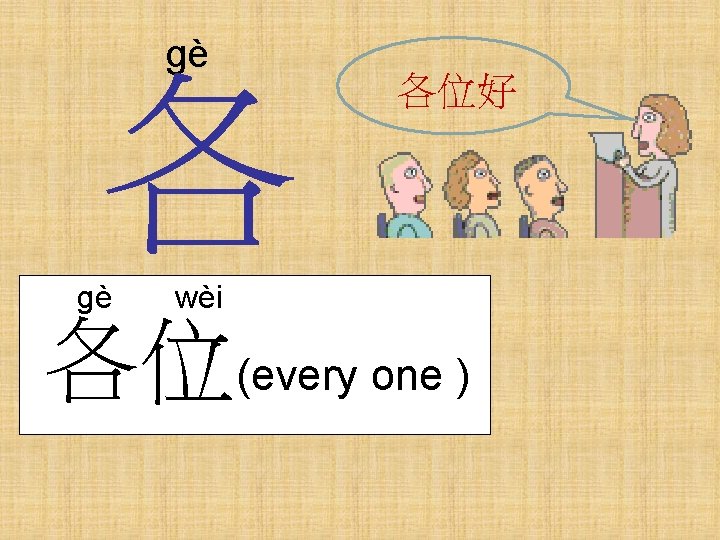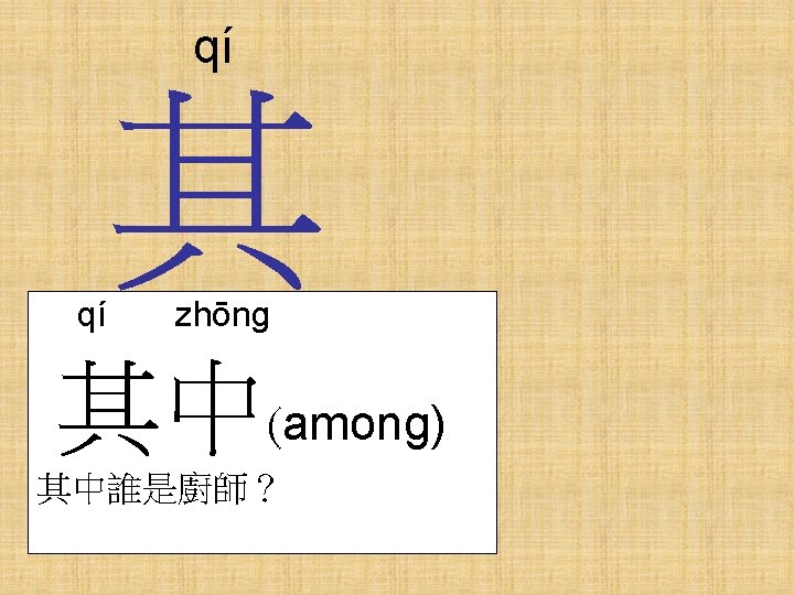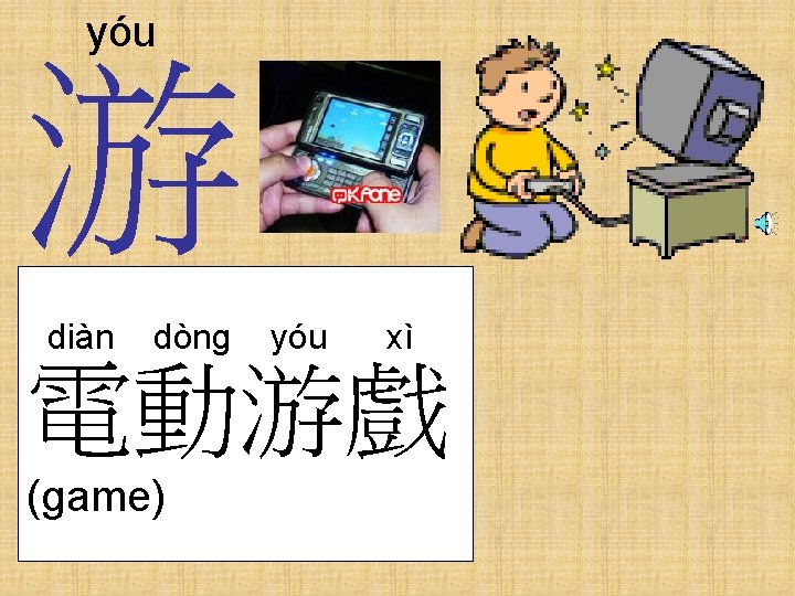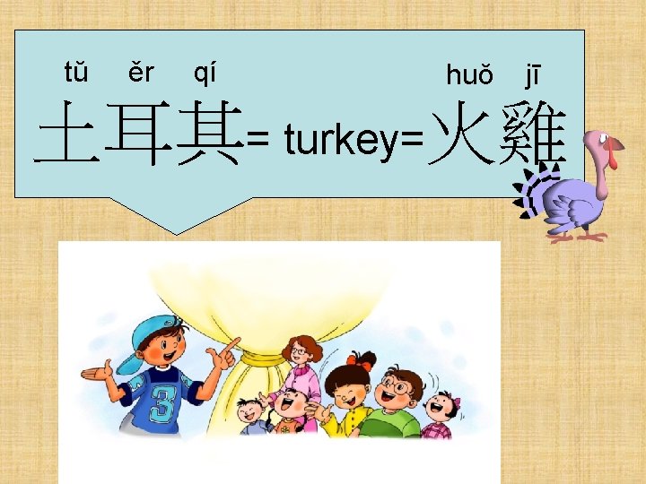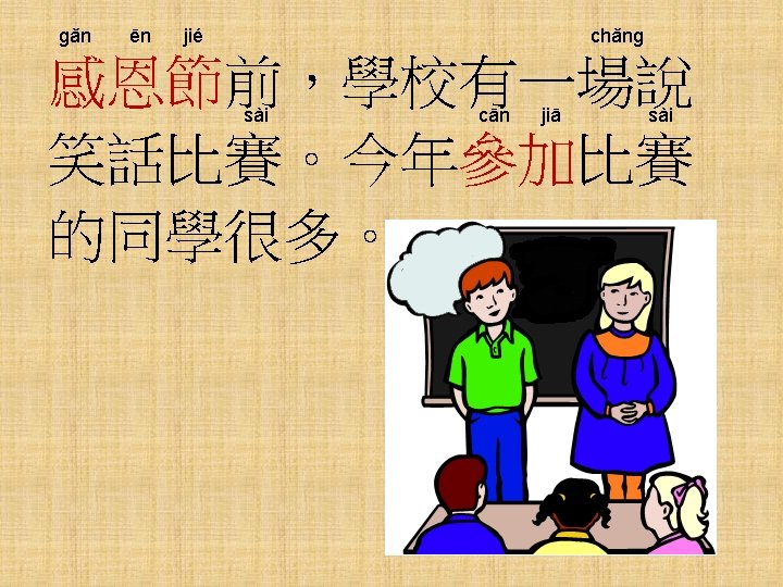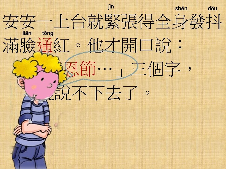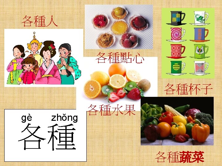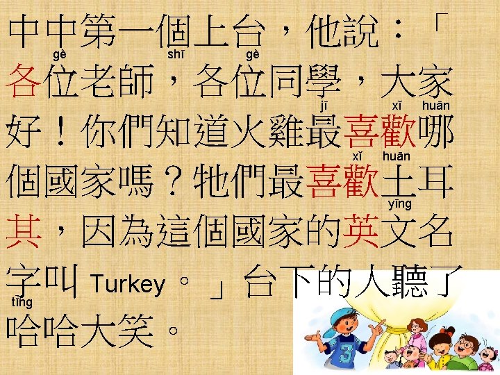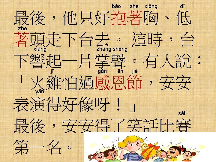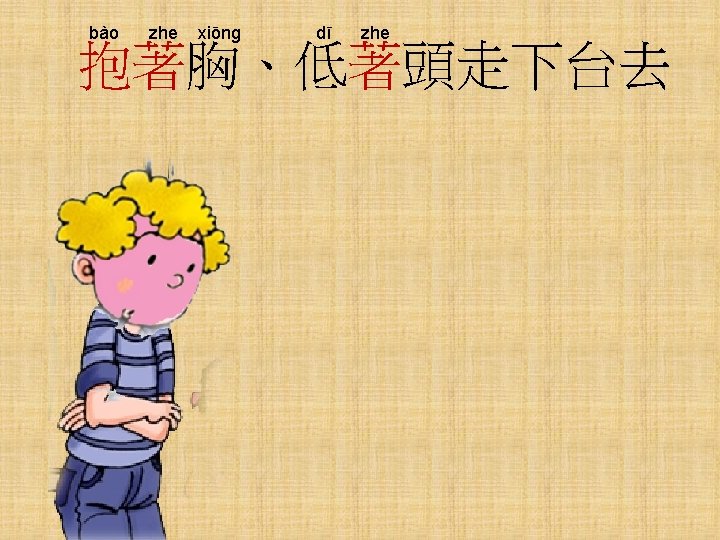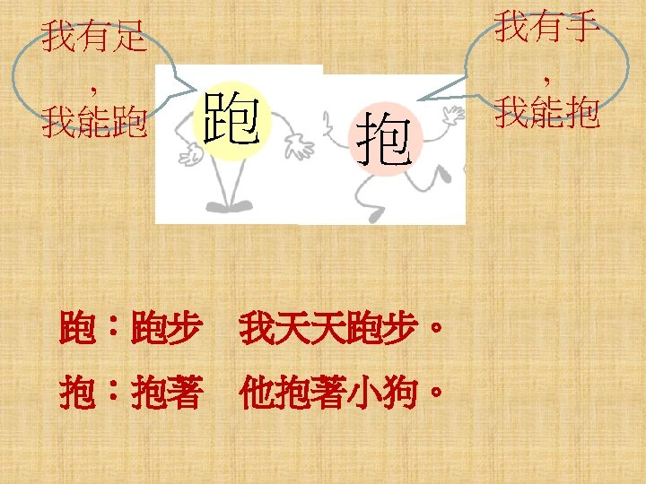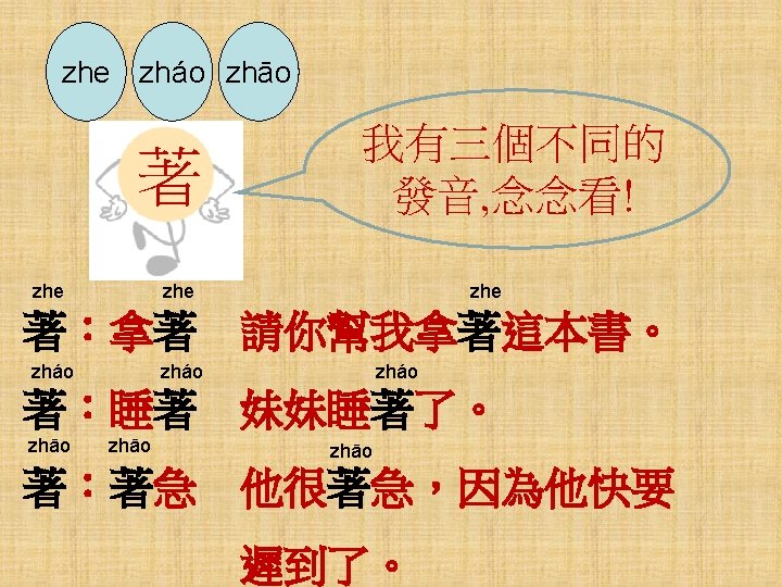 g g zhng various q q t other Slides: 33 Download presentation gè 各 gè zhŏng 各種(various) qí 其 qí tā 其他 ( other than) yīng 英 yīng wén 英文 (English) yīng 英 yīng guó 英國(England) yóu 游 yóu xíng 游行(parade) tōng 通 jiāo tōng 交通(transportation) tōng 通 kă tōng 卡通(cartoon) bào 抱 bào zhe 抱著 (to hold in the arm) bào 抱 bào yuàn 抱怨 (to complain) zhe 著 kàn zhe 看著 ( looking at) zhe 著 ná zhe 拿著 ( holding ) zhe 著 ná zhe 吃著 ( eating ) The Particle著 "著"signifies the continuation of an action or a state. Its function is descriptive. When 著is used between two verbs, the one that precedes著signifies the accompanying action, while the second verb signifies the main action. 用手抱著球跑。
