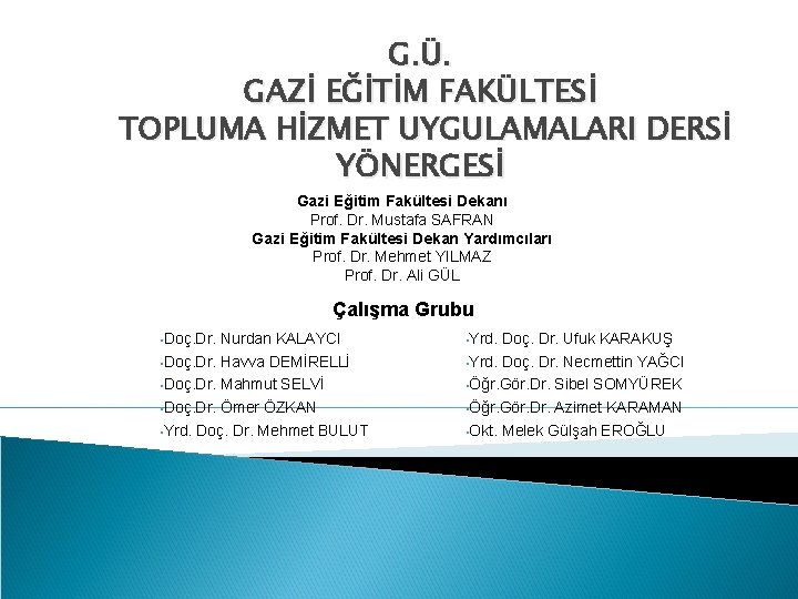 G. Ü. GAZİ EĞİTİM FAKÜLTESİ TOPLUMA HİZMET UYGULAMALARI DERSİ YÖNERGESİ Gazi Eğitim Fakültesi Dekanı Prof. Dr. Mustafa SAFRAN Gazi Eğitim Fakültesi Dekan Yardımcıları Prof. Dr. Mehmet YILMAZ Prof. Dr. Ali GÜL Çalışma Grubu • Doç. Dr. Nurdan KALAYCI • Doç. Dr. Havva DEMİRELLİ • Doç. Dr. Mahmut SELVİ • Doç. Dr. Ömer ÖZKAN • Yrd. Doç. Dr. Mehmet BULUT • Yrd. Doç. Dr. Ufuk KARAKUŞ • Yrd. Doç. Dr. Necmettin YAĞCI • Öğr. Gör. Dr. Sibel SOMYÜREK • Öğr. Gör. Dr. Azimet KARAMAN • Okt. Melek Gülşah EROĞLU