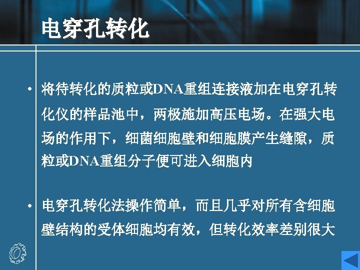 Transformation efficiency • The quality of a given preparation of competent cells may be measured by determining the transformation efficiency, defined as the number of colonies formed (on a selective plate) per microgram of input DNA, where that DNA is a pure plasmid, most commonly the vector to be used in a cloning experiment. • 每毫克载体DNA转化后,受体细胞接纳DNA的 个数,即克隆数 • 转化率的用途:利用转化率和重组率等参数可以帮助设计 DNA重组实验规模 • 转化率的影响因素