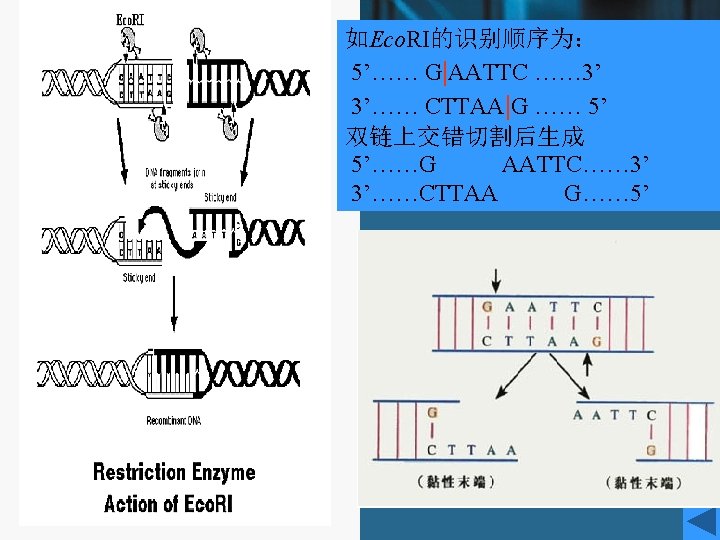 Recognition sequences • Eco. RI • Hundreds of restriction enzymes are now known, and a large number are commercially available. • They recognize sites ranging in size from 4 to 8 bp or more, and may give products with protruding 5`or 3`- tails or blunt ends. The newly formed 5`- ends always retain the phosphate groups. • Type of recognition sequence • The extremely high specificity of restriction enzymes for their sites of action allows large DNA molecules and vectors to be cut reproducibly into defined fragments.