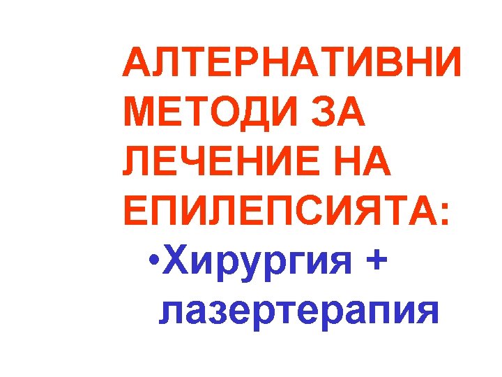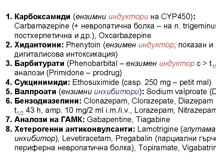 ИЗБОР НА АНТИЕПИЛЕПТИЧНО ЛЕКАР Grand mal: I избор – валпроати или Lamotrigine. Алтернатива – Carbamazepine, Topiramate или Phen Petit mal: I избор – Ehosuximide или валпроати. Алтернатива – Clonazepam или Lamotrigine Парциални гърчове: I избор – Carbamazepine ил валпроати. Алтернатива – Phenytoin, Lamotrigine, Vigabatrin, Top Status epilepticus: I избор – Diazepam или Loraze Алтернатива – Phenobarbital (i. m. /i/v. )