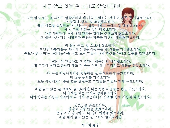 If I Knew – kimberly kirberger • I would listen more carefully to what my heart says. I would enjoy more, worry less. I would know that school would end soon enough and work would well, never mind. I wouldn"t" worry so much about what other people were thinking. I would appreciate all my vitality and tight skin. I would play more, fret less. I would know that my beauty is in my love of life. I would know how much my parents love me and I would believe that they are doing the best they can. I would enjoy the feeling of "being in love" and not worry so much about how it works out. I would know that it probably won"t but that something better will come along. I wouldn"t be afraid of acting like a kid. I would be braver. I would look for the good qualities in everyone and enjoy them for those. I would not hang out with people just because they"re "popular. " I would take dance lessons. I would enjoy my body just the way it is. I would trust my girlfriends. I would be a trustworthy girlfriend. I wouldn"t trust my boyfriends. (Just kidding. ) I would enjoy kissing. Really enjoy it. I would be more appreciative and grateful, for sure.