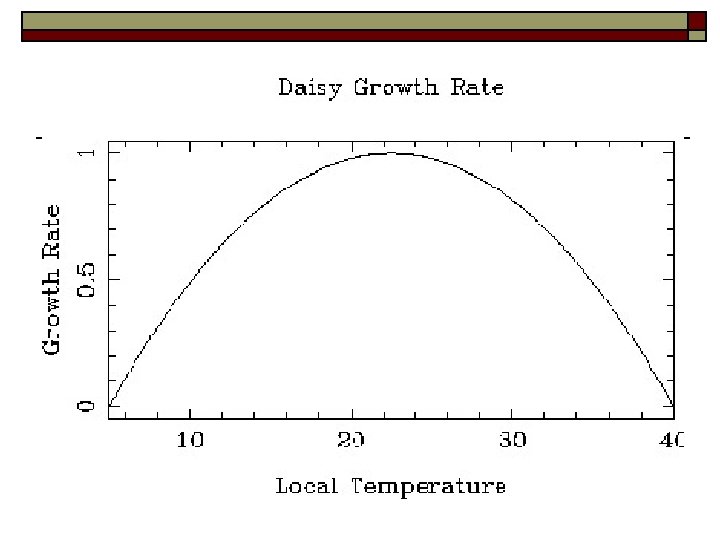 SIMPLE RULES o o In Daisy. World, daisies find 22. 5 degrees Celsius just perfect. At that temperature their birthrate is a maximal 1. 0. Their birthrate drops off to zero at 5 and 40 degrees Celsius. The deathrate is constant.