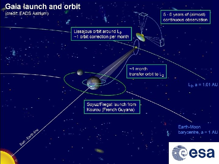 • Gaia is the next Astrometry mission of the European Space Agency • Will be launched towards the end of 2013 • Main Objectives: – Build a 3 D map of the Galaxy – History and evolution of the Milky Way – Stellar Astrophysics – Multiple systems, exoplanets – Solar System Asteroids – General Relativity
