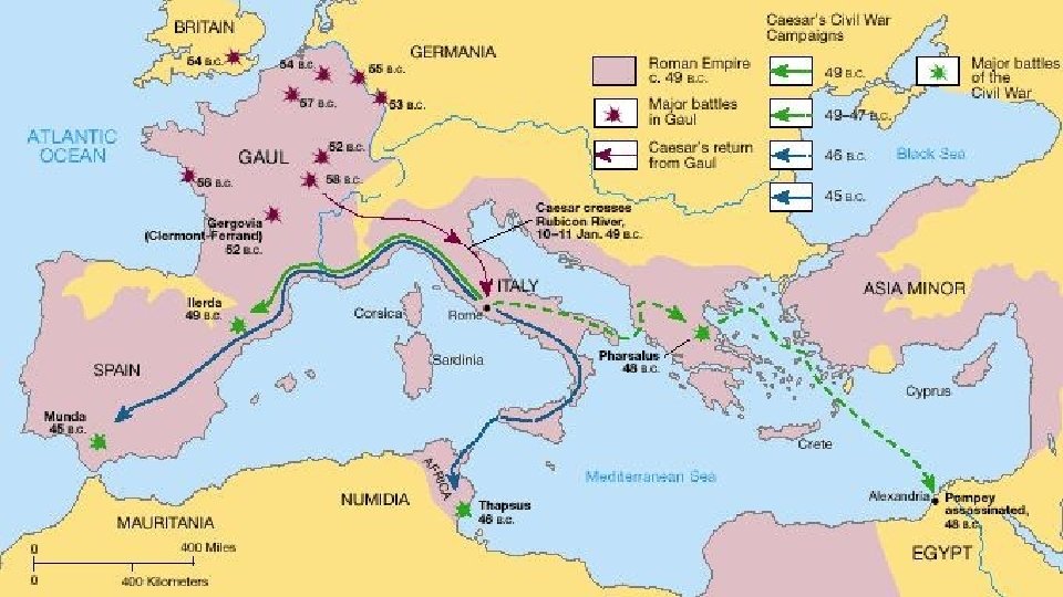 Pompeius byl poražen v Řecku v roce 48 př. n. l. U Farsálu Uprchl do Egypta Zde byl Ceaser zavražděn Ptolemaiem XIII Ceaser dosadil na trůn Kleopatru XII Spojení s Kleopatrou vyvolalo válku s Ptolemaiem XIII, při níž shoržela část Alexandrijské knihovny