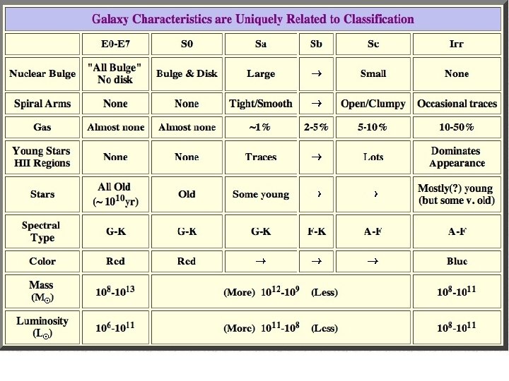 Disk Component: stars of all ages, many gas clouds Spheroidal Component: bulge & halo, old stars, few gas clouds Blue-white color indicates ongoing star formation Red-yellow color indicates older star population