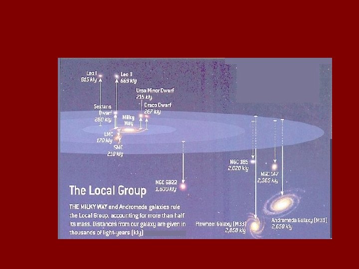 The Milky Way • A galaxy is a huge body of stars and other matter in space. • Milky Way shows: - Prominent spiral arms - Central galactic bulge - Location of Sun - A member of a small cluster of galaxies called the Local Group. - Andromeda is the nearest galaxy to us.