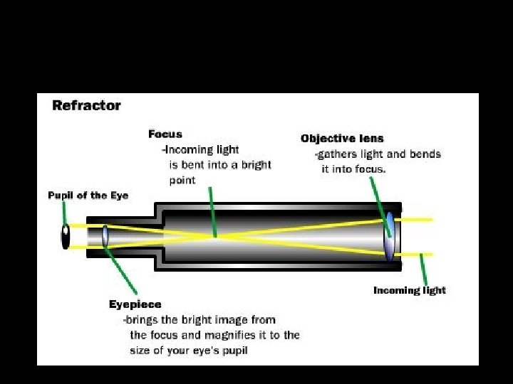 Optical Telescopes – Telescopes that use light to produce magnified images of objects. Refracting Telescopes • Refraction is the bending of light as it passes through different materials. • A convex lens is used to bend the light and is magnified. • Galileo built the 1 st refractor.