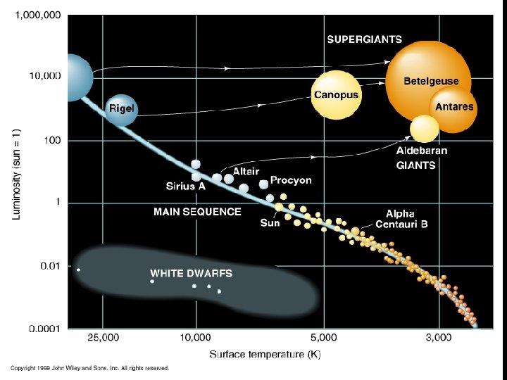 The Main Sequence Ø Contains hot, blue giant stars that are very bright to cooler, red dwarf stars that are very dim. Ø Yellow, medium sized stars are in the middle of the Main Sequence like the Sun.