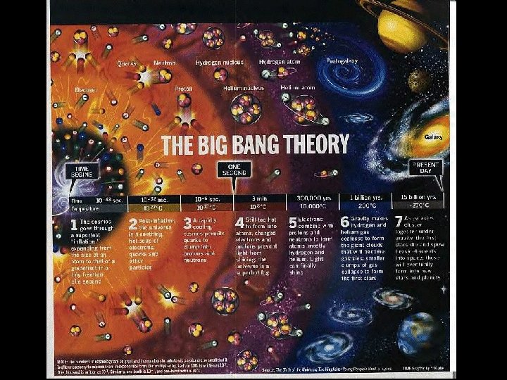 The Big Bang Theory • All energy & matter was created in an instant with an initial explosion. • The matter rapidly expanded throughout space in a swirling, dense mass. • Matter began to collect into clumps. As matter cooled, hydrogen & helium gases formed. • Eventually the first stars will form followed by galaxies, etc while still expanding.