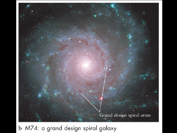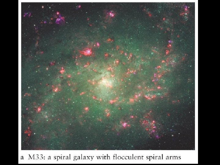 Types of Galaxies • The Hubble classification system groups galaxies into four major types: spiral, barred spiral, elliptical, and irregular. • The arms of spiral and barred spiral galaxies are sites of active star formation. • According to theory of self-propagating star formation, spiral arms of flocculent galaxies are caused by the births and deaths of stars over extended regions of a galaxy. Differential rotation of a galaxy stretches the star-forming regions into elongated arches of stars and nebulae that we see as spiral arms.