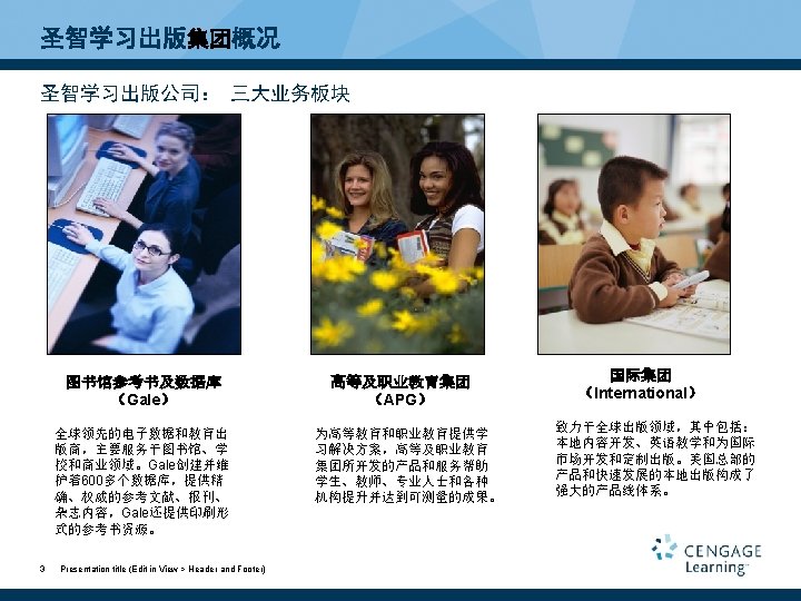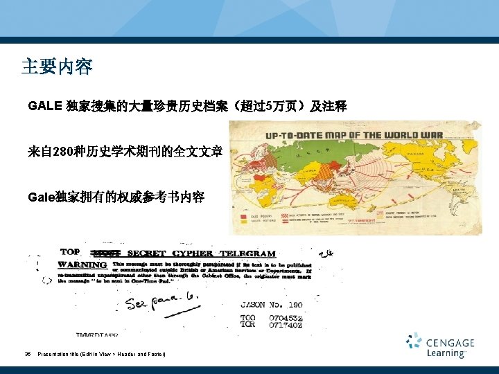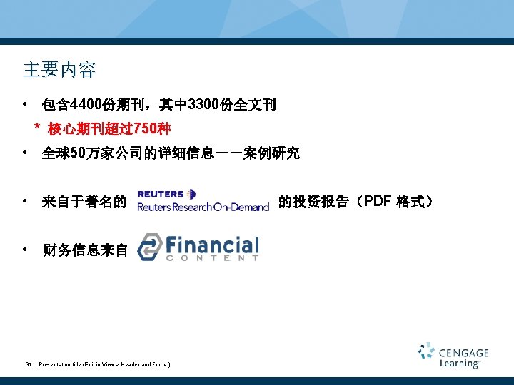 Gale的今天 Gale四个CALIS数据库的特点? 17 Presentation title (Edit in View > Header and Footer)
