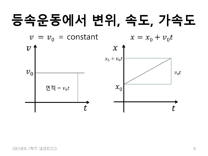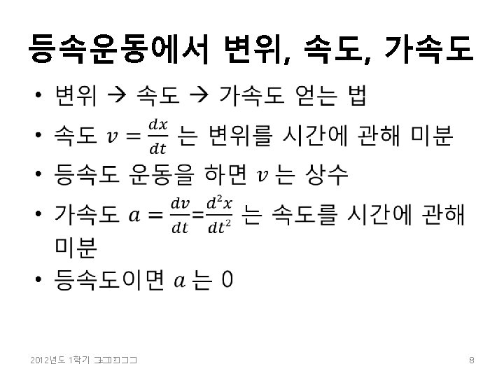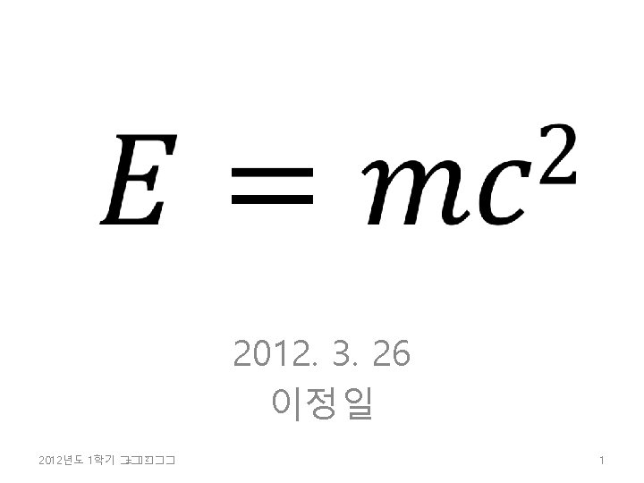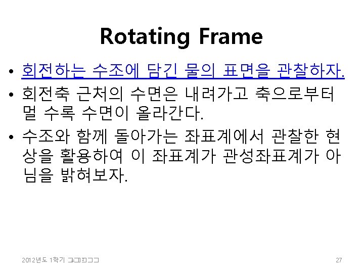 Galilean Transformation and Newtonian Mechanics 2 2012 1 Slides: 28 Download presentation Galilean Transformation and Newtonian Mechanics 2 2012년도 1학기 �� =���� 2 Law of Inertia 2 2012년도 1학기 �� =���� 3 Inertial Reference Frame • 2 2012년도 1학기 �� =���� 4 Galilean Transformation • 2 2012년도 1학기 �� =���� 그림출처: http: //psi. phys. wits. ac. za/teaching/Connell/phys 284/2005/lecture-01/lecture_01/node 5. html 6 Invariant/Covariant under Galilean Transformation • • • Time is invariant Mass is invariant Coordinates are covariant Velocities are covariant Acceleration is invariant Force is invariant 2 2012년도 1학기 �� =���� 7 Galilean Transformation • 2 2012년도 1학기 �� =���� 11 Free Fall (two balls) 2 2012년도 1학기 �� =���� 그림출처: Halliday, Resnick, Walker, 일반물리학 개정 8판 제 1권 , 범한서적 p. 80 Fig. 4 -11 15 Pendulum at rest I 2 2012년도 1학기 �� =���� 17 Pendulum at rest Ⅱ 2 2012년도 1학기 �� =���� 18 Accelerating Frame 2 2012년도 1학기 �� =���� 19 If S’ is accelerating with A • 2 2012년도 1학기 �� =���� 20 Scale on the Floor • scale 2 2012년도 1학기 �� =���� 21 Elevator and Weight • scale 2 2012년도 1학기 �� =���� 22 Elevator • 2 2012년도 1학기 �� =���� 그림출처: http: //psi. phys. wits. ac. za/teaching/Connell/phys 284/2005/lecture-01/lecture_01/node 5. html 23 Free falling scale • scale 2 2012년도 1학기 �� =���� Weightless! 25 Balance scale 2 2012년도 1학기 �� =���� 26