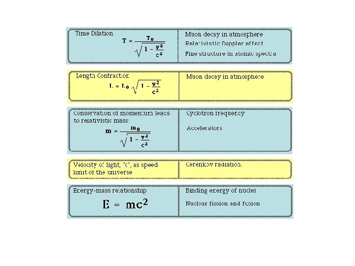 Mass, energy and momentum The formulation of dynamics in Special Relativity leads to the energy-mass relationship = mo c 2 E = mc 2 includes both the kinetic energy and rest mass energy for a particle. The kinetic energy T of a high speed particle can be calculated from Notice that, for small velocities The relativistic momentum of a particle is given by