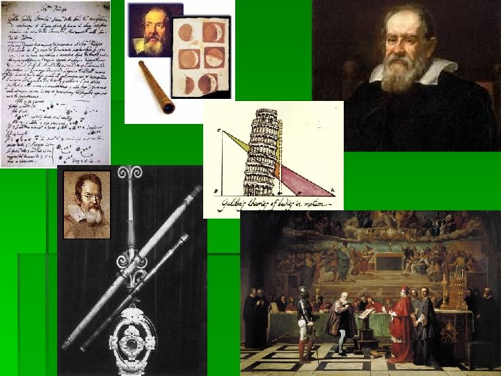 OBJEVY § Znamenají zásadní průlom ve středověkém myšlení § Zákon setrvačnosti § Jinak těžká tělesa padají k zemi stejnou rychlostí § Dalekohled § Princip nezávislosti a skládání pohybů § Geometrický a vojenský kompas