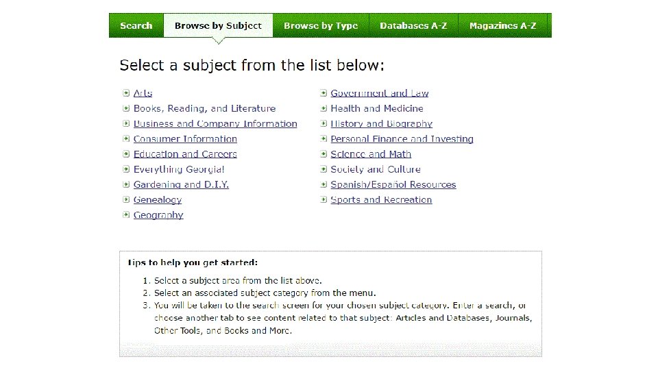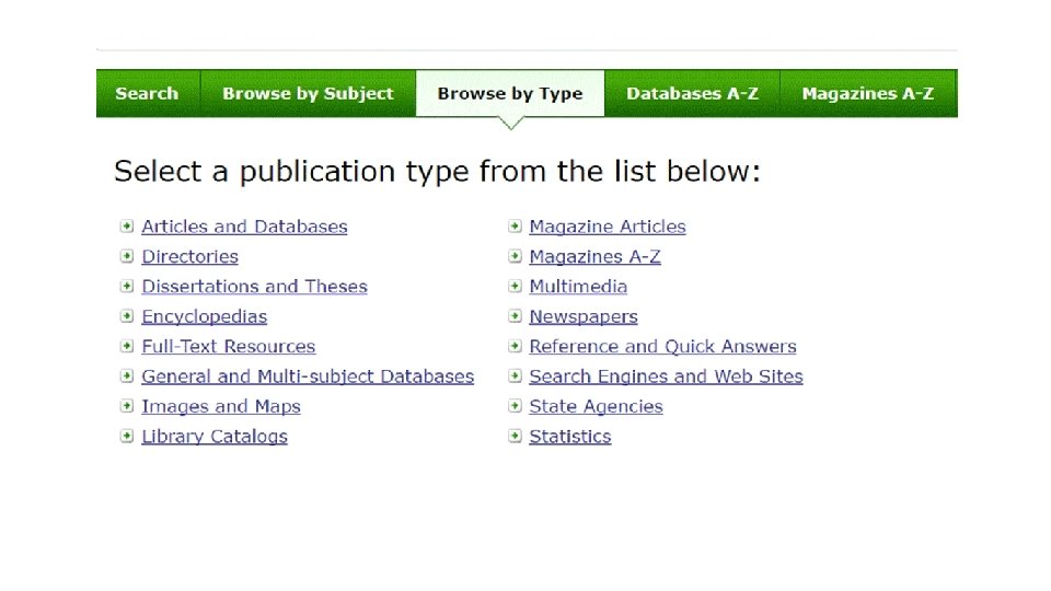 Navigation basics • Discover Search (Search lots of resources at once) • Discover Search Resource linking (Find full text) • A-Z Lists (Databases, Publications) • Browse by subject • Browse by Type of resource (Almanac, Encyclopedia, etc. ) • Help!? & Support Services