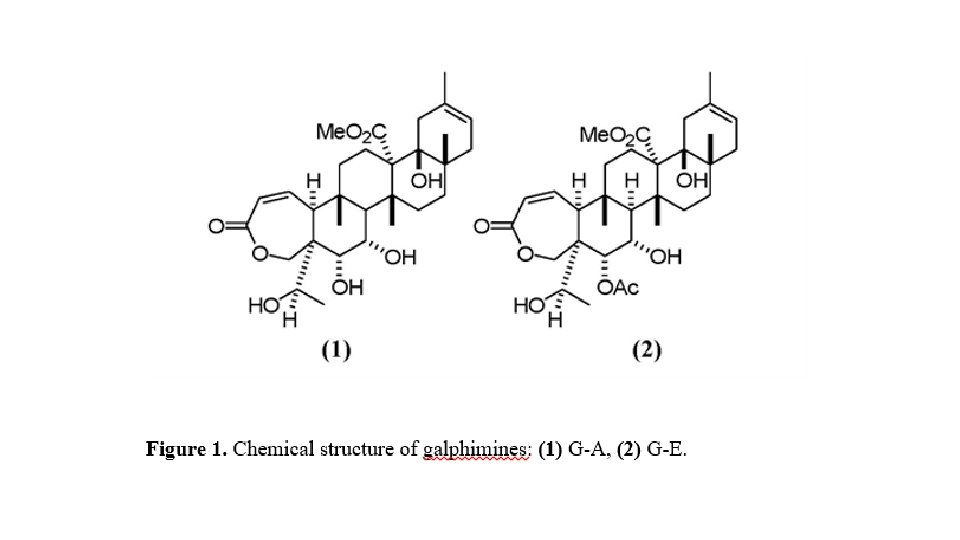 Galphimines Galphimine. Most Active A (G-A) E (G-E) Most abundant anxiolytic compound in this plant Overall the most abundant galphimine Galphimine. B (G-B) Most potent anxiolytic galphimine Found at very low concentrations Inactive in its natural form, can be converted to G-A. Methodologically (González 2014). complicated to (Abarca 2014, Hierra 2006). isolate and purify (Drosh et al. 1992, A. Neszmélyi et. Al 2007).