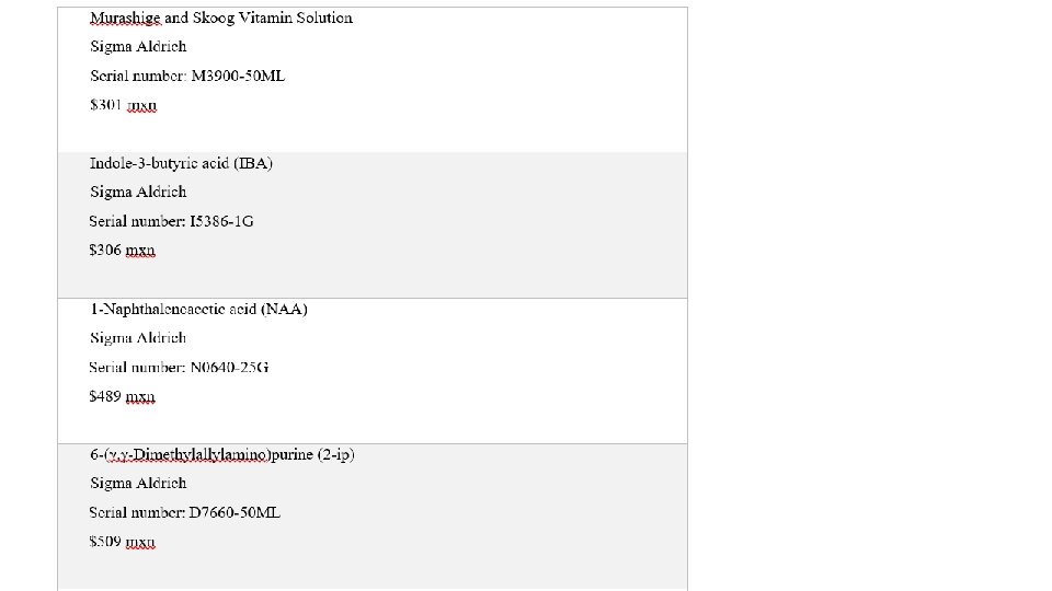 Specific Objectives 1. 2. 3. 4. 5. Medium preparation Micropropagacion Medium with varying concentrations of IBA and NAA with half strength MS solutions and 1/3 th concentration of cytokinins 2 ip and Kinetin in relation to the auxins Root induction Data analysis