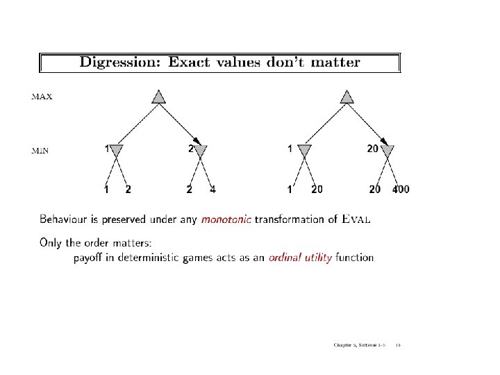 Cutting off search • One solution: cut off tree before game ends • Replace – Terminal(s) with Cutoff(s) – Utility(s, p) with Eval(s, p) – e. g. , stop at some max depth – estimate position quality • Does it work in practice? – – – bm ≈ 106, b ≈ 35 → m ≈ 4 4 -ply look-ahead is a poor chess player 4 -ply ≈ human novice 8 -ply ≈ typical PC, human master 12 -ply ≈ Deep Blue, human grand champion Kasparov 3512 ≈ 1018 (Yikes! but possible, with other clever methods)