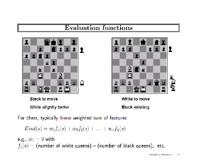 Static (Heuristic) Evaluation Functions • An Evaluation Function: – Estimate how good the current board configuration is for a player. – Typically, evaluate how good it is for the player, and how good it is for the opponent, and subtract the opponent’s score from the player’s. – Often called “static” because it is called on a static board position – Ex: Othello: Number of white pieces - Number of black pieces – Ex: Chess: Value of all white pieces - Value of all black pieces • Typical value ranges: [ -1, 1 ] (loss/win) or [ -1 , +1 ] or [ 0 , 1 ] • Board evaluation: X for one player => -X for opponent – Zero-sum game: scores sum to a constant
