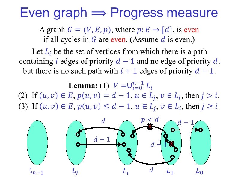 Exercise: Complete the details of the proof. (In particular, prove the lemma on the previous slide. ) What is the complexity of finding a progress measure for even graphs?