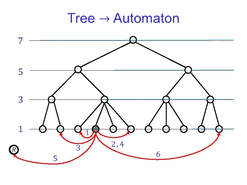 Tree Automata A tree automata explores all infinite paths in the input binary tree. It accepts a tree if every infinite path satisfies an acceptance condition, e. g. , a parity condition. Different transition rules for going left and right. Applications in logic: Decidability of monadic second-order logic.