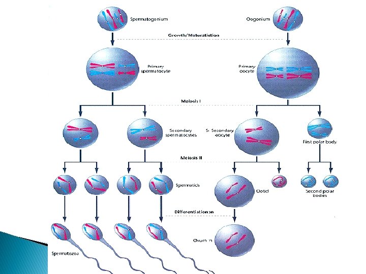 Period of proliferation Daughter Spermatogonium 46 Period of growth primary spermatocytes 46 1 st meiotic division Period of maturation secondary spermatocytes 23 2 nd meiotic division Early spermatid 23 Mature sperm At puberty
