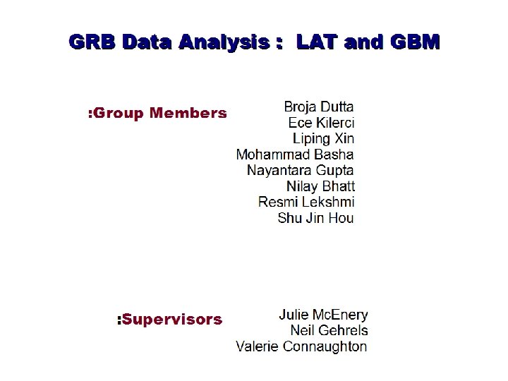Fermi GRB Sample GRB T 90 (sec. ) class Ep (ke. V) z Energy Flux (8 ke. V-100 Me. V) (erg/s cm 2) LAT Boresight (deg. ) LAT Swift GRB 080916 C 66 L 424 4. 3 2 E-05 52 Y Y GRB 090510 0. 3 S 4400 0. 9 4. 0528 E-06 10 Y Y GRB 090902 B 21 L 798 1. 78 E-05 51 Y Y GRB 091221 68. 5 L 207 2. 8849 E-07 53 N Y GRB 100116 A 110 L 1240 9. 4648 E-07 29 Y No GRB 100131 A 6. 25 L 132. 1 1. 31 E-06 51 N Suzak u GRB 100206 A 0. 128 S 506 7. 1671 E-06 44. 7 N Y