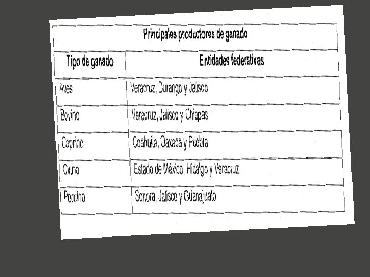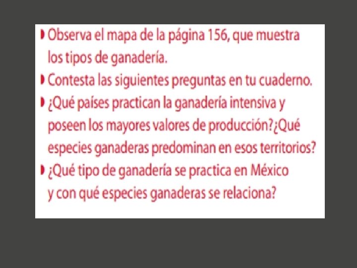 La ganadería extensiva • Se realiza en terrenos grandes, ya que los animales pastan. En algunos terrenos es importante considerar el cultivo de pastizales Predomina en Veracruz, Tabasco, Campeche y Quintana Roo.