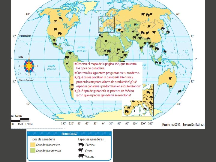 Tipos de ganado • Los espacios ganaderos y agrícolas se complementan debido a que el ganado no solo consume pastos naturales, sino también forraje cultivado. La ganadería se practica en pastizales en diversas regiones del mundo. Los tipos de ganado son: - Bovino, Caprino, Ovino, Porcino, Caballar y la avicultura o aves de corral. - La apicultura es el cuidado de las avejas.