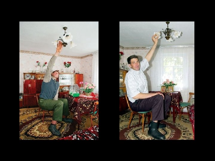 Il doit s'asseoir pour changer une ampoule au lustre du plafond.
