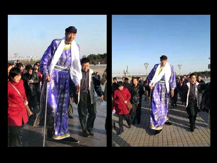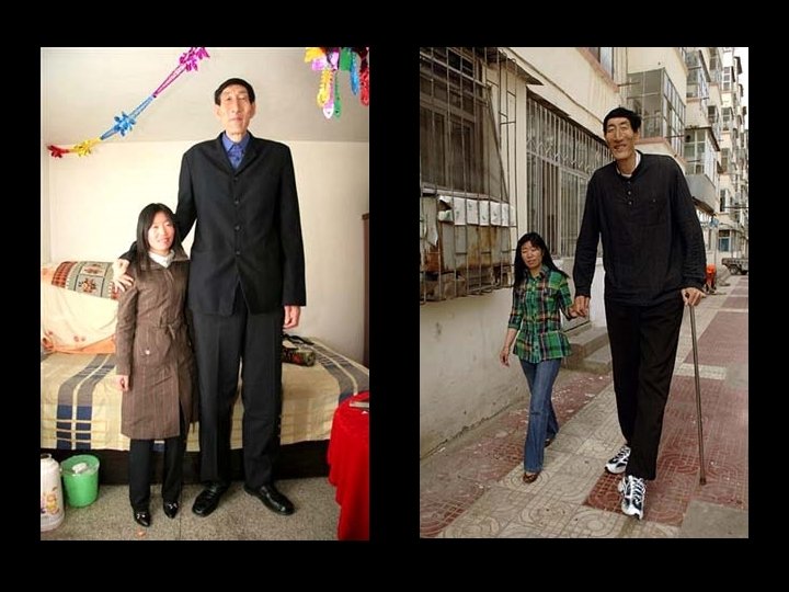 Bao Xishun Ce mongol de 58 ans mesure 2, 36 mètres (ses pieds mesurent 33 centimètres). Il a épousé en 2005 Xia Shujuan, 28 ans, taille 1, 68 mètre. Il est l'attraction partout où il passe !