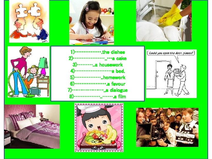 1)He has just have a bath. 2)He has just washed the dishes. 3)She has just married. 4)H e has just painted a picture. 5)She has just cried. a c b d e