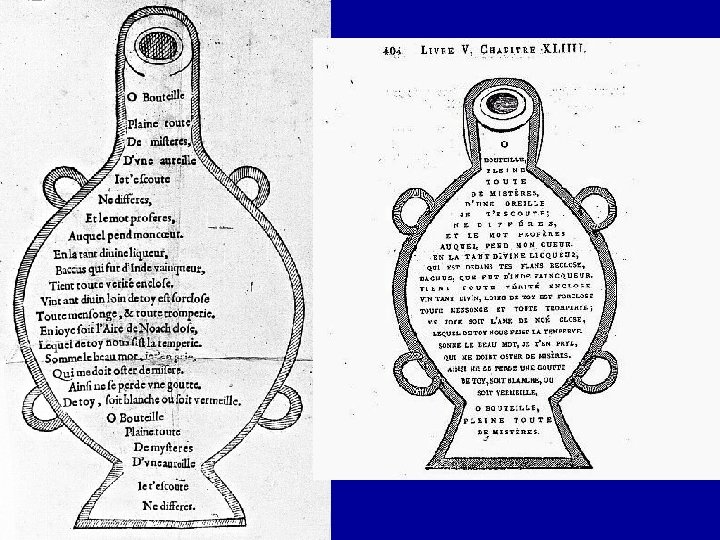 • On s'embarque donc, pour consulter l'oracle de la Dive Bouteille, seul espoir dans la quête d'une certitude. • Dans la suite du Tiers Livre, le Quart Livre semblait promettre le « fin mot » ; dans son déroulement, il n'y parvient pas, renvoyant à une suite problématique l'ultime question, l'ultime réponse. • La Dive Bouteille ne parle que dans le Cinquième Livre; tout le récit porte la marque de ce retard, aménageant un itinéraire de 67 chapitres avant le moment de conclure. • Le Quart Livre apparaît, à plus d'un égard, comme un rassemblement de digressions.