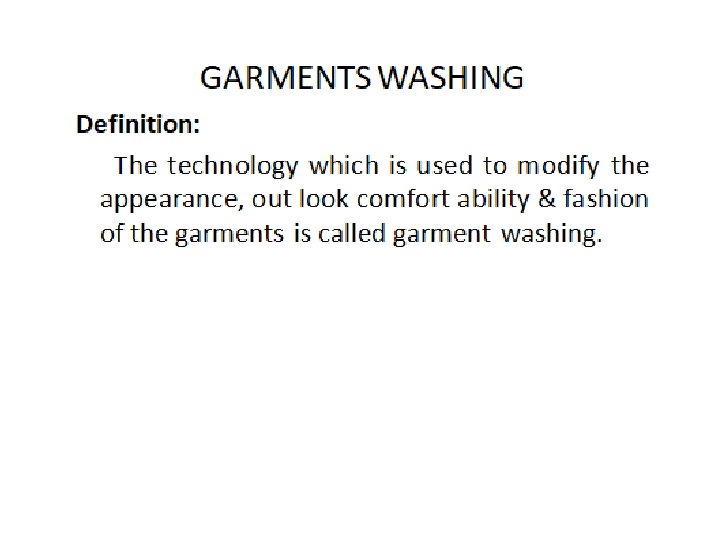 Continued…. • It should be created color or tinted affect in the garments which also seems the best touch of the garments. • It should be created faded affect in the garments. • It should be possible to wearing directly the garments after purchasing from the shop. • Should be used new/ modern/ latest machines. • It should also be produced fading affect in the specific area of the garment as per specific design. • It should be comparatively more profitable than others.