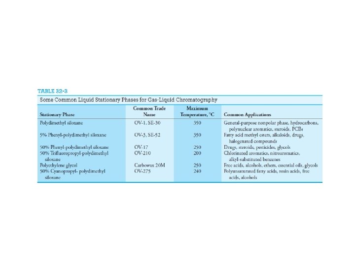 Some Widely Used Stationary Phases Table 32 -3 lists the most widely used stationary phases for both packed and open tubular column gas chromatography in order of increasing polarity. These six liquids can probably provide satisfactory separations for 90% or more of samples. Five of the liquids listed in Table 32 -3 are polydimethyl siloxanes that have the general structure